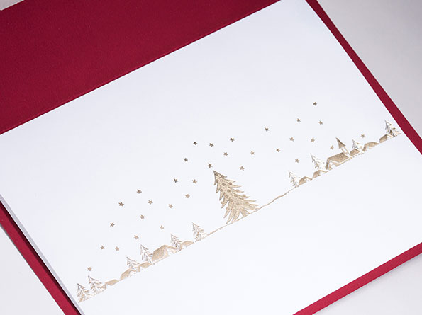 Diese edlen Weihnachtskarten für Firmen beeindrucken mit einer aufwendig gearbeiteten Goldfolienprägung auf der Vorderseite und einer kunstvollen Papierprägung im Inneren.