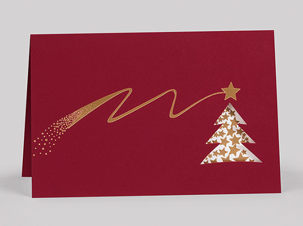 Ein ausgestanzter Weihnachtsbaum sorgt für einen charmanten Blickfang und verleiht der Karte eine besondere Tiefe. Ergänzt wird das Design durch den weißen Einleger, der mit kleinen, goldgeprägten Sternen dekoriert ist – perfekt, um Ihre individuellen Weihnachtsgrüße, Ihr Firmenlogo oder Unterschriften stilvoll einzusetzen.